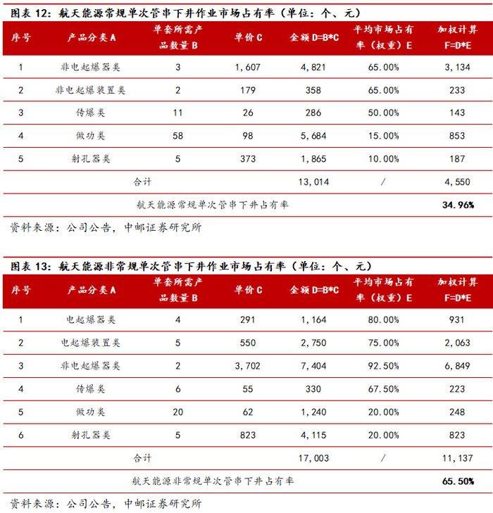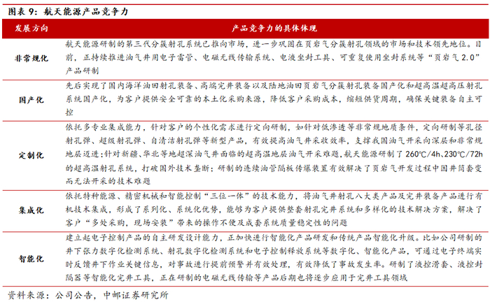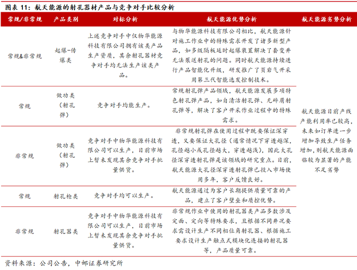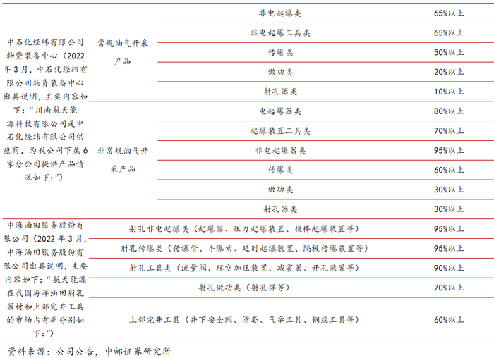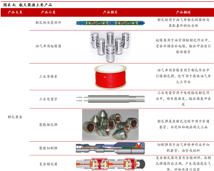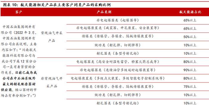 航天能源常规/非常规油气射孔产品占比较高,特别是在高附加值、高技术含量的非常规油气开采产品中占比超60%;在常规油气开采领域市占率约为35%。