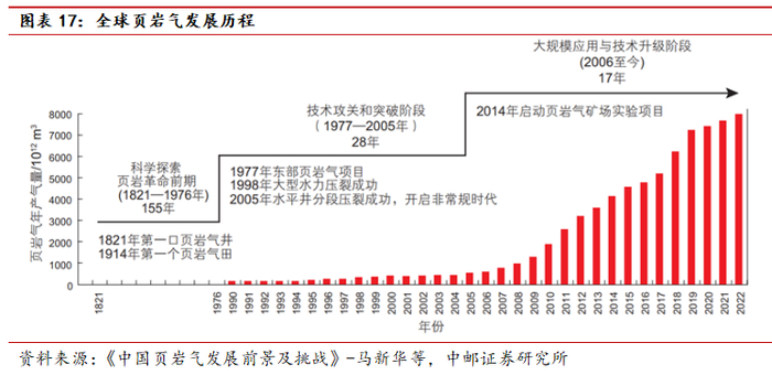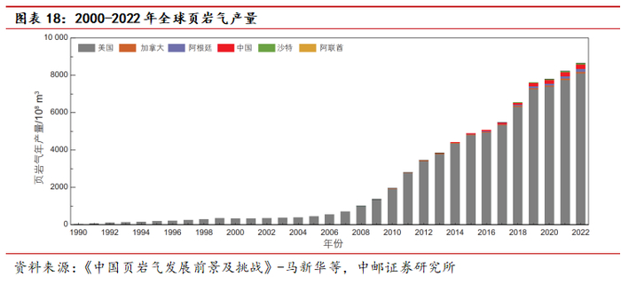 全球页岩气资源丰富,估算地质资源量1014万亿立方米、可采资源量为243万亿立方米(EIA)。页岩气开发历经科学探索(1821-1976年,155年)、技术突破和规模应用(1977-2005年,28年)、技术升级(2006至今,17年)3个阶段。在美国率先突破页岩气商业开发后,加拿大、中国、阿根廷、沙特和阿联酋五个国家也陆续跟进。2000年以来,页岩气产量经历了20多年的飞速增长(年均增速17%),2022年全球页岩气产量8547亿立方米,占全球天然气总产量的21.2%。