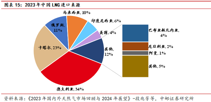 2023年,国内天然气消费量为3917亿立方米,国内天然气产量为2353亿立方米,对外依存度依然高达40%,其中,进口天然气中,管道气进口量为671亿立方米,主要来自中俄东线,LNG进口量为984亿立方米,主要来自澳大利亚、卡塔尔、俄罗斯等国。