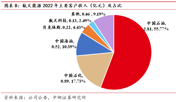 航天能源主要客户包括中石油、中石化、中海油、哈利伯顿、贝克休斯等国内外知名能源企业。同时,航天能源亦从事军用爆破器材相关业务,提供质量稳定、安全可靠的军用爆破器材产品,助力航天强国和军工能力建设。2022年,公司前五大客户分别为中石油、中石化、中海油、贝克休斯、航天科技,占公司营收比例分别为56%、18%、10%、4%、2%;2023年,航天能源营业收入构成上,中石油、中石化和中海油占公司营业收入比重与2022年相比基本保持稳定,军品收入同比高速增长。