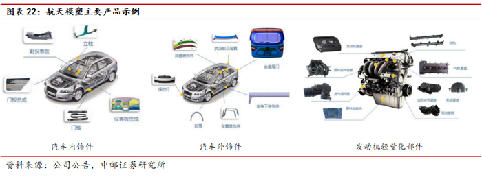 航天模塑的汽车内饰件产品主要包括主仪表板总成、副仪表板总成、门板总成、立柱内护板、EPP发泡件等;航天模塑的汽车外饰件产品主要包括保险杠总成、扰流板总成、全塑尾门总成、车身下装饰件、通风盖板总成、挡泥板等;航天模塑生产的发动机轻量化部件主要包括发动机进气歧管、压力管、燃油轨、汽缸罩盖等。