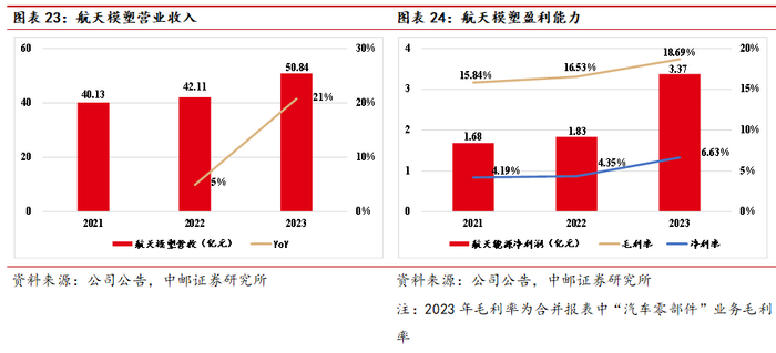 2023年,受益于中国汽车行业的高速发展,以及航天模塑产品结构升级、关键客户开拓、亮点车型中标、核心技术研发方面取得的突破,航天模塑营业收入增长20.75%,经营业绩再创新高,营业收入增速超过行业销量增速。