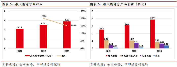 2023年,航天能源实现营业收入5.80亿元,同比增长15%。其中,射孔器材收入3.87亿元,机电控制类产品营收0.86亿元,完井工具0.65亿元,军品0.40亿元。