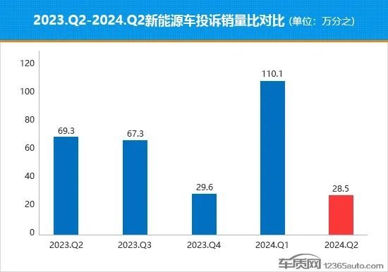 据国内领先的缺陷汽车产品信息收集平台车质网数据显示,2024年二季度共受理国内新能源车投诉量累计为11,407宗,乘联会数据显示同期国内新能源车(纯电动、插电混动、增程式)销量约为233.8万辆,涵盖290款车型。为确保数据的准确性,车质网本次只统计这290款车型的首次投诉案例,计算得出2024年二季度新能源车投诉销量比均值为万分之28.5,数值较一季度万分之110.1的均值出现阶梯式下降,整体投诉销量比表现有明显转好迹象。