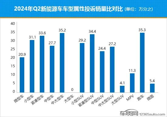 从各车型属性的投诉销量比数值变化来看,紧凑型车、中型车、中大型车和紧凑型SUV表现抢眼,四者的数值均从一季度的三位数降至两位数,短期投诉销量比表现进步较大。值得注意的是,本季度有部分车型属性的投诉销量比数值有所提升,其中以小型车的增长幅度最大,环比超过1倍。此外,二季度共有6个车型属性的投诉销量比数值高于同期新能源车万分之28.5的均值,给新能源车整体投诉销量比表现拖了后腿。
