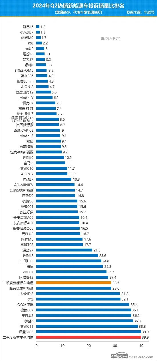 作为国内领先的缺陷汽车产品信息收集平台,车质网采用“投诉销量比”评价体系,对2024年二季度国内新能源车进行分析。据统计,二季度国内新能源车销量均值为8,060辆(平均月销量约为2,687辆),在有销量数据支撑的290款车型中共有70款车型销量超过该均值,成为二季度热销新能源车型。其中,有47款车型表现优于二季度新能源车投诉销量比均值万分之28.5,在国内热销新能源车型中具备良好的口碑基础,产品质量稳定性表现好于国内其他新能源车型。这些热销车型投诉销量比具体表现如下: