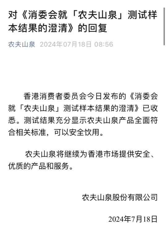 7月18日,农夫山泉对香港消费者委员会就测试样本结果的澄清发布回应称,香港消费者委员会发布的《消委会就“农夫山泉”测试样本结果的澄清》已收悉。测试结果充分显示农夫山泉产品全面符合相关标准,可以安全饮用。农夫山泉表示将继续为香港市场提供安全、优质的产品和服务。