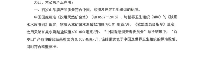 百岁山在声明中称,测评发布后,互联网平台上部分媒体报道称“来自内地的农夫山泉、百岁山瓶装水溴酸盐达欧盟上限,或有可能引起恶心腹痛”。部分报道曲解检测结果,与事实不符,误导消费者,严重损害公司的合法权益。
