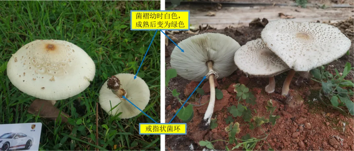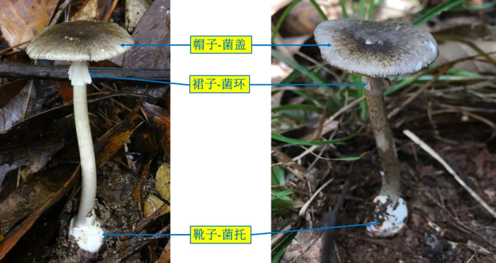 识别要点:与剧毒的肝损害型鹅膏类似,头上带帽(菌盖),腰间系裙(菌环),脚上穿靴(菌托)。