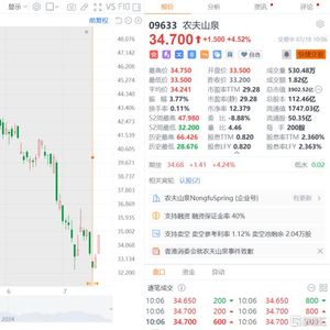 安全问题澄清后,农夫山泉今日涨超5%,报35港元,总市值3936.26亿港元,为连续第二日反弹。