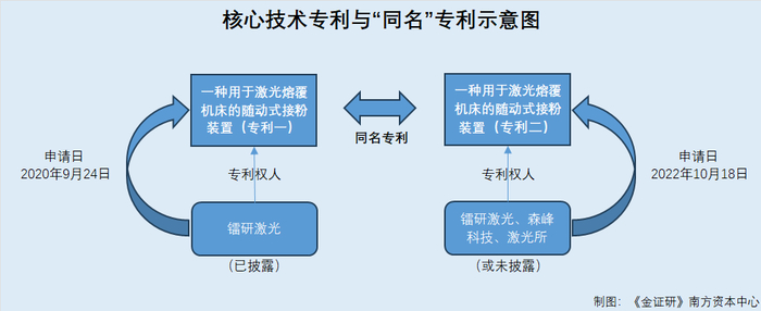 换言之,2020年9月24日,镭研激光申请了其核心技术对应专利“一种用于激光熔覆机床的随动式接粉装置”即“激光熔覆专利一”。此后的2022年10月18日,镭研激光、森峰科技与其产学研单位激光所,申请了旨在对激光熔覆专利一其中的缺陷进行克服的同名专利“激光熔覆专利二”。