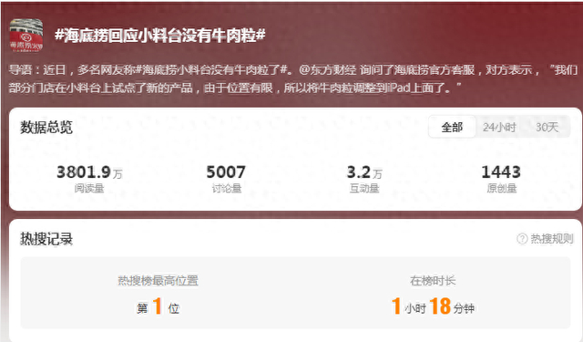 今天,话题#海底捞回应小料台没有牛肉粒#登上微博热搜榜第一,引发网友关注。