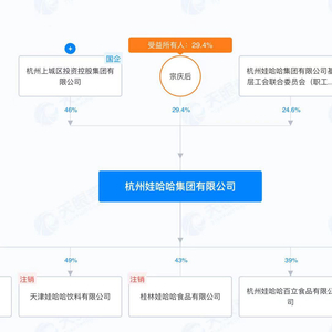 天眼查数据显示,杭州娃哈哈集团有限公司(以下简称“娃哈哈集团”)目前的法定代表人仍是宗庆后。娃哈哈集团大股东为杭州市上城区文商旅投资控股集团有限公司(简称为“上城文商旅控股”),持股占46%。该公司实际控制人为杭州市上城区财政局。
