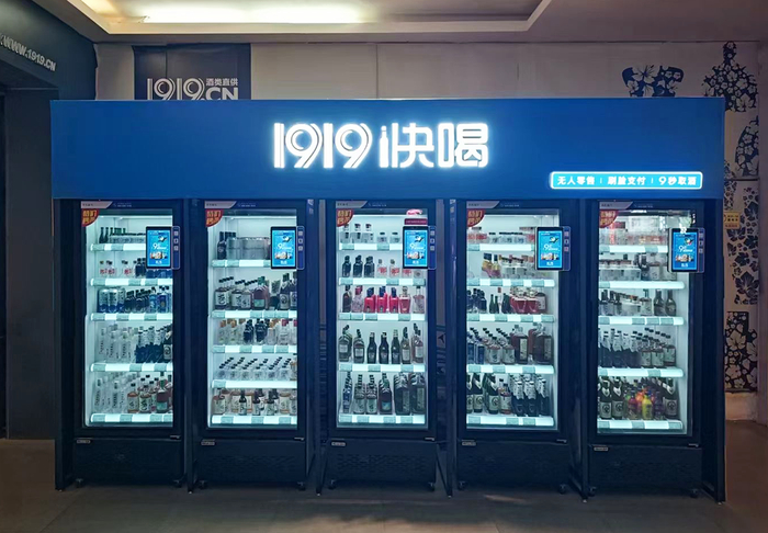 2020年“无接触零售”概念兴起,1919依托自有门店推出了数千台“快喝”无人售酒机,主要放置在改造后的自身门店外,以及餐饮、商超等人流量较大之地,率先探索酒类无人零售。