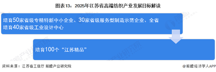 根据《关于进一步推动全省纺织服装产业高质量发展的若干政策措施》,江苏省明确指出:到2025年底,全省培育50家省级专精特新中小企业、30家省级服务型制造示范企业、全省培育40家省级工业设计中心、力争实现全省纺织服装规模以上企业首席质量官制度全覆盖,全省累计培育100个“江苏精品”,争创一批纺织服装领域的中国工业大奖、中国质量奖和江苏省省长质量奖。