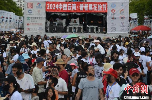 7月18日,2024中国云南·普者黑“花脸节”开幕。当日,万人齐聚云南省丘北县共度“花脸节”。“花脸节”是丘北县彝族的传统节日,因远古先民用锅烟把脸抹黑驱魔除害的传说而得名,人们用香米稻草灰制成黑色颜料相互涂抹,以表达“抹黑全身,吉祥一生”的美好祝愿。中新社记者 缪超 摄