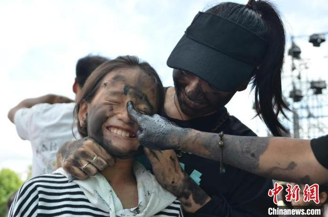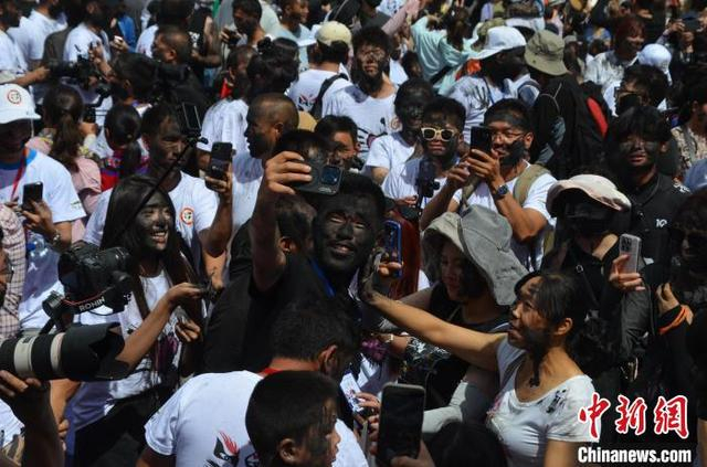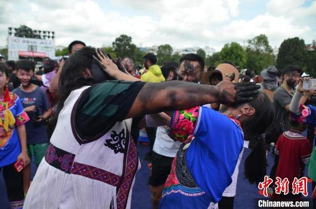 7月18日,民众参加“花脸节”互抹花脸送祝福。当日,万人齐聚云南省丘北县共度2024中国云南·普者黑“花脸节”。“花脸节”是丘北县彝族的传统节日,因远古先民用锅烟把脸抹黑驱魔除害的传说而得名,人们用香米稻草灰制成黑色颜料相互涂抹,以表达“抹黑全身,吉祥一生”的美好祝愿。 中新社记者 缪超 摄