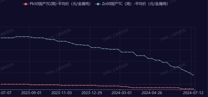 不过虽然铅锌价格在2024年上半年均呈现上涨态势,但是双方市场毫无例外地均陷入了供应端紧缺的困境。矿端供应紧俏,导致前锌精矿加工费一跌再跌,纷纷降至其历史新低。截至7月12日,Zn50国产TC(周)跌至1600~2000元/金属吨,均价报1800元/金属吨;7月12日,Pb50国产TC(周)暂时持稳于500~700元/金属吨,均价报600元/金属吨。