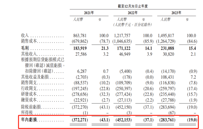 2021年至2023年,博泰车联网分别实现营收8.64亿元、12.18亿元、14.96亿元,同期分别净亏损3.72亿元、4.52亿元、2.84亿元,三年累计净亏损超11亿元。经调整净亏损(非国际财务报告准则计量)分别为3.24亿元、3.91亿元和2.18亿元,共计超9亿元。