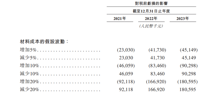 博泰车联网还提到材料成本的增加或减少导致的税前亏损的实际变化。以2023年为例,如果材料成本增加5%,对当期税前亏损的影响4500多万,如果增加10%,则税前亏损会达到9000万。