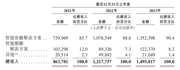 收入方面,博泰车联网的收入主要来源于智能座舱解决方案和智能网络解决方案。博泰车联网称,2021年-2023年,该公司累计售出约260万套智能座舱,复合年增长率达到55.2%。对应的收入分别为7.4亿、10.78亿、13.52亿。