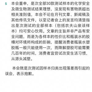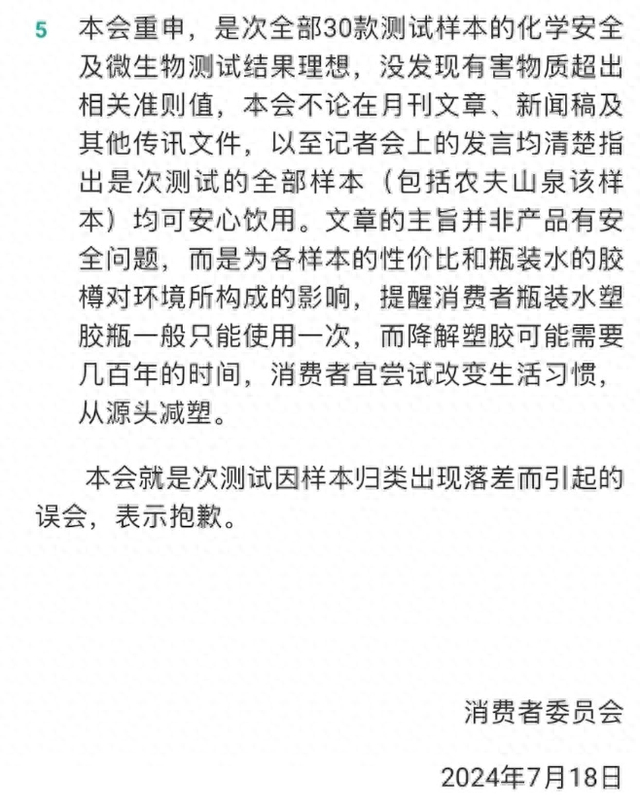 本会重申,是次全部30款测试样本的化学安全及微生物测试结果理想,没发现有害物质超出相关准则值,本会不论在月刊文章、新闻稿及其他传讯文件,以至记者会上的发言均清楚指出是次测试的全部样本(包括农夫山泉该样本)均可安心饮用。文章的主旨并非产品有安全问题,而是为各样本的性价比和瓶装水的胶樽对环境所构成的影响,提醒消费者瓶装水塑胶瓶一般只能使用一次,而降解塑胶可能需要几百年的时间,消费者宜尝试改变生活习惯,从源头减塑。