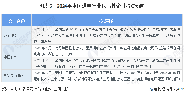 从煤炭行业代表性企业2024年的投资情况来看,国家能源集团有设计产能600万吨/年的煤矿项目开工;中国神华有2项生产规模800万吨/年的许可证获批,且进一步深入在下游电力市场的布局;苏能股份全资成立煤炭技术相关子公司。