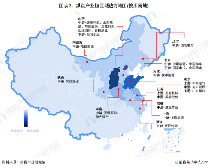 目前,煤炭产业链上的企业集中分布在我国的北部地区,尤其是山西省、北京市、山东省等地,不仅拥有较多的代表性企业,同时煤炭产业链布局也较为完善。