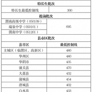 经渭南市中招领导小组研究,现将我市各县市区普通高中学校录取最低控制线公布如下: