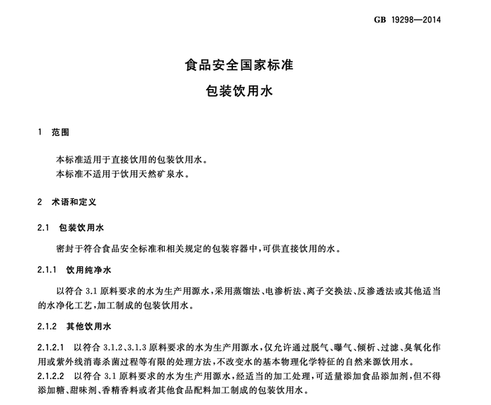 目前,有食品安全国家标准的只有“包装饮用水”和“饮用天然矿泉水”,在国标下,对这两种水有明确的定义和生产标准。