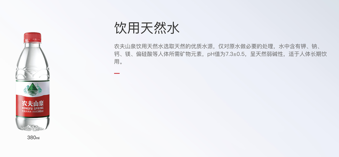 农夫山泉这一标准想要强调的是,对比其他包装饮用水,农夫的含有更多矿物元素。农夫山泉在其天然水产品介绍页面也着重强调,其仅对原水做必要的处理,水中含有钾、钙、钠、镁、偏硅酸等人体所需矿物元素。