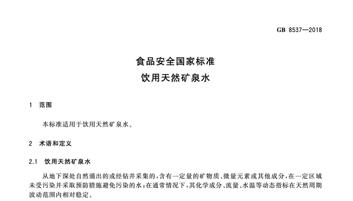 至于饮用天然矿泉水,根据《食品安全国家标准 饮用天然矿泉水》(GB 8537-2018),其定义是从地下深处自然涌出的或经钻井采集的,含有一定量的矿物质、微量元素或其他成分,在一定区域未受污染并采取预防措施避免污染的水。对能自称“天然矿泉水”的厂商,国家不仅有严格的技术要求,其批准、生产和检验、标志、包装、运输、贮存等环节均有具体规范。