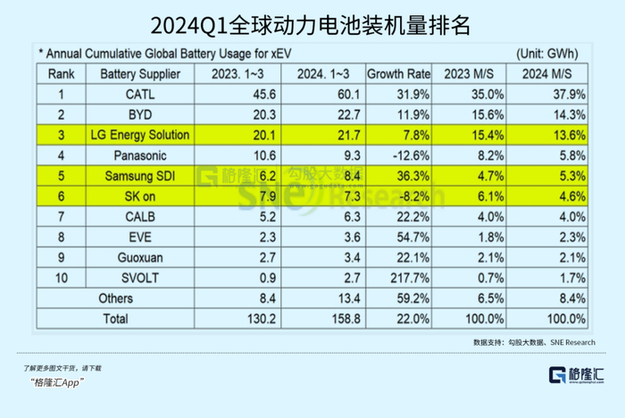 面对中创新航、亿纬锂能等国内厂商快速成长,今年一季度SK On装机量掉队明显(-8.2%),低于行业平均增速(22%),市占率也呈现下滑趋势。