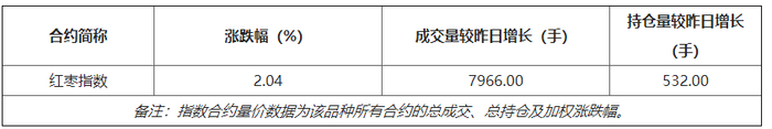 ◼红枣指数今日“价格涨跌幅为2.04%,持仓量较昨日增长532.00手,成交量较昨日增长7966.00手”,属于“量增价涨”的信号。