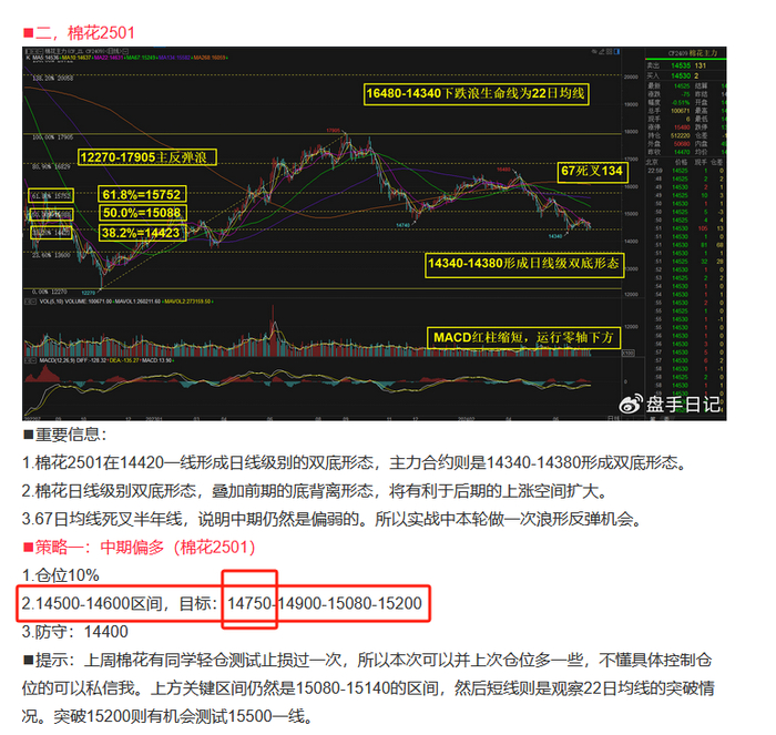 从棉花多次探底14500一线支撑情况看,棉花的底部箱体14500-14700区间的盘整已经确认,后期关注上方压力情况,重要压力区间仍然是15080-15140区间。在这次跟踪棉花的情况看,还是有同学保留底仓的问题上,再次接单的方式处理的是很好,虽然策略是一直获利的,但没有通过震荡走势扩大化。