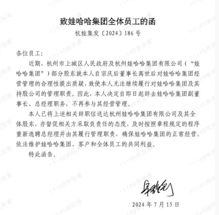 这份文件称,近期上城区政府、杭州娃哈哈集团有限公司(“娃哈哈集团”)部分股东就其自宗庆后董事长离世后对娃哈哈集团经营管理的合理性提出质疑,使其无法继续履行对集团及其持股公司的管理职责,决定自7月15日起辞去娃哈哈集团副董事长、总经理职务,不再参与经营管理。宗馥莉表示,已将辞职信送达杭州娃哈哈集团有限公司及其全体股东,亦督促相关方及时按章程规定的程序重新选聘总经理并履行管理职责,确保集团正常经营,维护企业、客户和全体员工的共同利益。