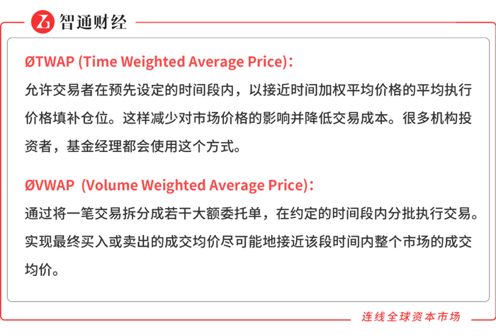 如果回购和普通大宗的方法很难退出,因为机构持有的股票数量较多,不妨和经纪商合作,将股票存入经纪商后,后经纪商通过人工或者算法来卖出,这样虽然减持的时间略有拉长,但是可以减少对于股价的冲击,而且保护自身信息。其中的算法订单包括TWAP和VWAP两种。