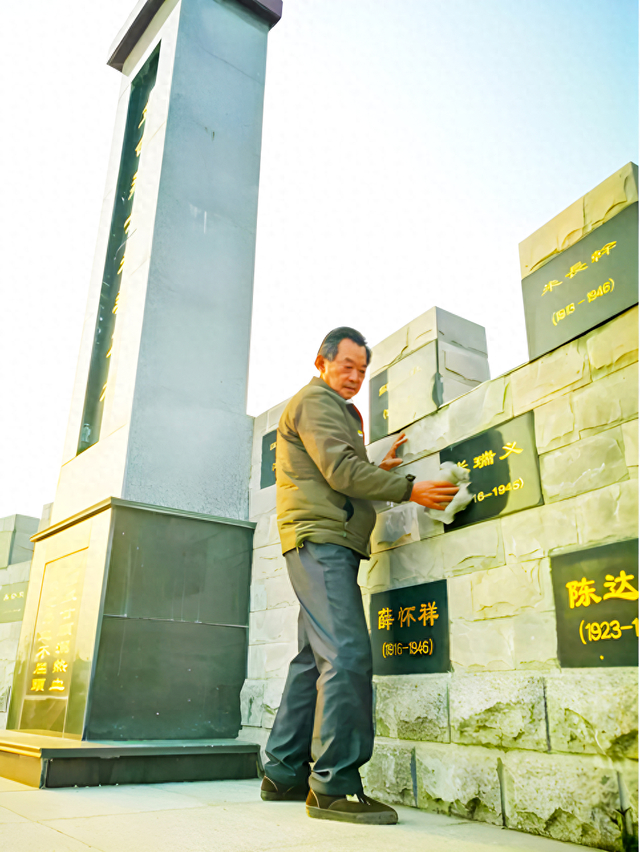 一年除夕,杨文华带着30岁的大孙子和21岁的小孙子,一起来到朱堆村英雄纪念碑前,清扫落叶,敬献祭品。“爷爷,是什么力量让你坚持寻访好几年,做成了这么一件了不起的事情?”小孙子问道。