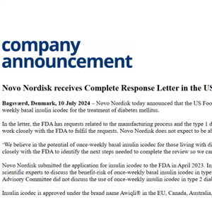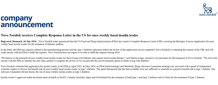 7月11日,诺和诺德发布消息表示,其一周一次的胰岛素产品未能获得美国食品药品管理局(FDA)批准