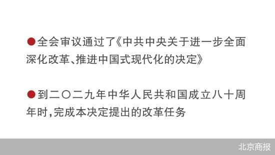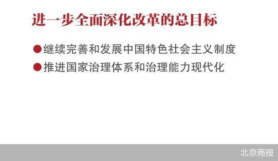全会指出,进一步全面深化改革的总目标是继续完善和发展中国特色社会主义制度,推进国家治理体系和治理能力现代化。到二〇三五年,全面建成高水平社会主义市场经济体制,中国特色社会主义制度更加完善,基本实现国家治理体系和治理能力现代化,基本实现社会主义现代化,为到本世纪中叶全面建成社会主义现代化强国奠定坚实基础。要聚焦构建高水平社会主义市场经济体制,聚焦发展全过程人民民主,聚焦建设社会主义文化强国,聚焦提高人民生活品质,聚焦建设美丽中国,聚焦建设更高水平平安中国,聚焦提高党的领导水平和长期执政能力,继续把改革推向前进。到二〇二九年中华人民共和国成立八十周年时,完成本决定提出的改革任务。