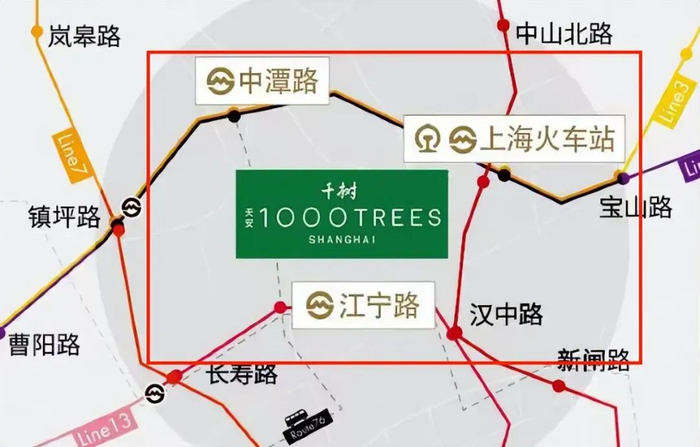 因为,虽然靠近上海江宁路、中潭路和上海火车站地铁站,但是都不与地铁直接接轨,而离天安千树最远的地铁站至少需要步行15到20分钟。
