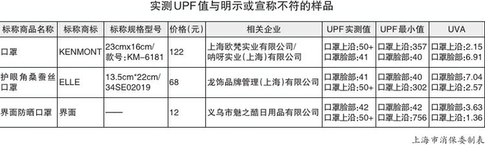 上海市消保委指出,消费者在网购防晒口罩(面罩)时往往会留意UPF值,不少商家会宣称高UPF值以吸引消费者关注。另外,本次采购的样品中,个别样品UPF宣称值远超过50,最高标为2000。例如标称由上海医束美生物科技有限公司生产销售的玻尿酸远红外面罩,其网页宣称UPF2000,实测UPF值仅为669。关于UPF数值的标识,相关标准要求,当UPF>50时,应标为UPF50+。建议消费者在选购防晒口罩(面罩)时,不必追求UPF值过高的商品。