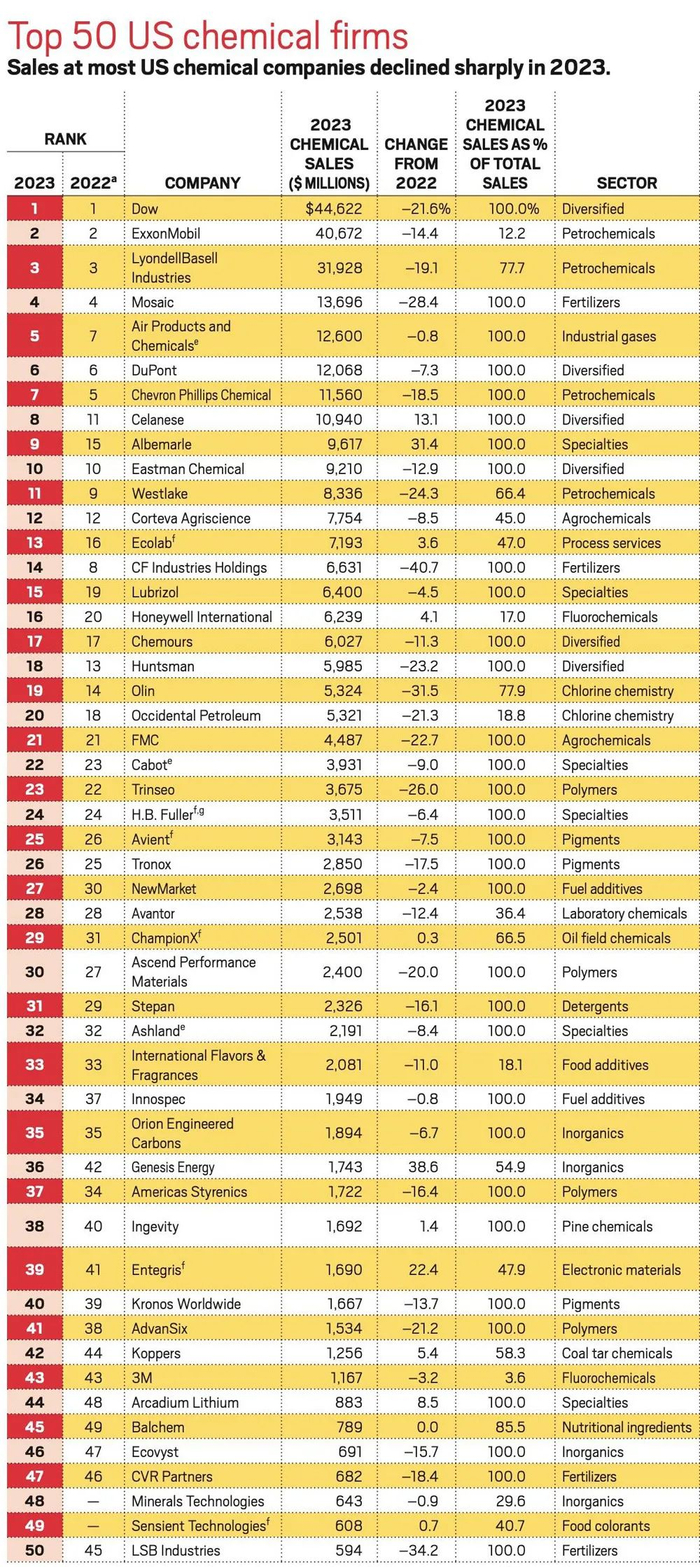 2024美国最大50家化学公司榜单,38家收入比上财年下降