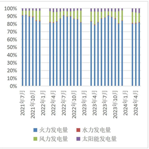 全省发电总量基本持平。2024年5月,山西省总发电量313.80 亿千瓦时,同比-0.82%;其中,火电发电量256.70 亿千瓦时,同比-1.10%;水力发电量2.10 亿千瓦时,同比-16.60%;风力发电量36.00 亿千瓦时,同比-17.60%;太阳能发电量19.02 亿千瓦时,同比+26.20%。