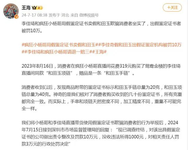 根据王海的描述,2023年8月16日,一位消费者在疯狂小杨哥的直播间花费319元购买了所谓“鸳鸯金楼”品牌的和田玉项链,并附赠一条和田玉手链。然而,该消费者在收到商品后发现,所附的鉴定证书标注的和田玉手链和项链的总重量分别为20克和40克,且在核对了几十份鉴定证书后,发现所有证书上标示的重量均完全一致。王海指出,由于手串和项链的天然密度和加工精度不同,它们的重量不可能完全相同,此举引发了对证书真伪的怀疑。