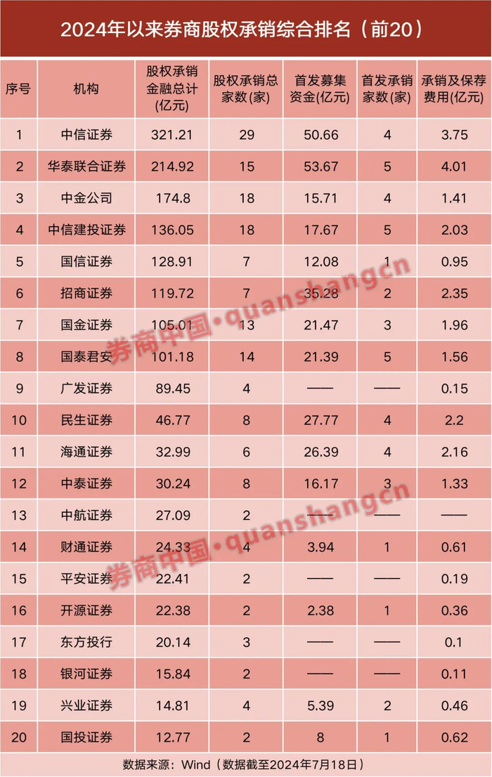 Wind数据显示,按照上市日口径,截至7月18日,2024年以来券商股权承销总计223家,股权承销总金额1814.08亿元(含首发、增发、可转债、可交换债等),合计揽入承销与保荐费用30.14亿元。