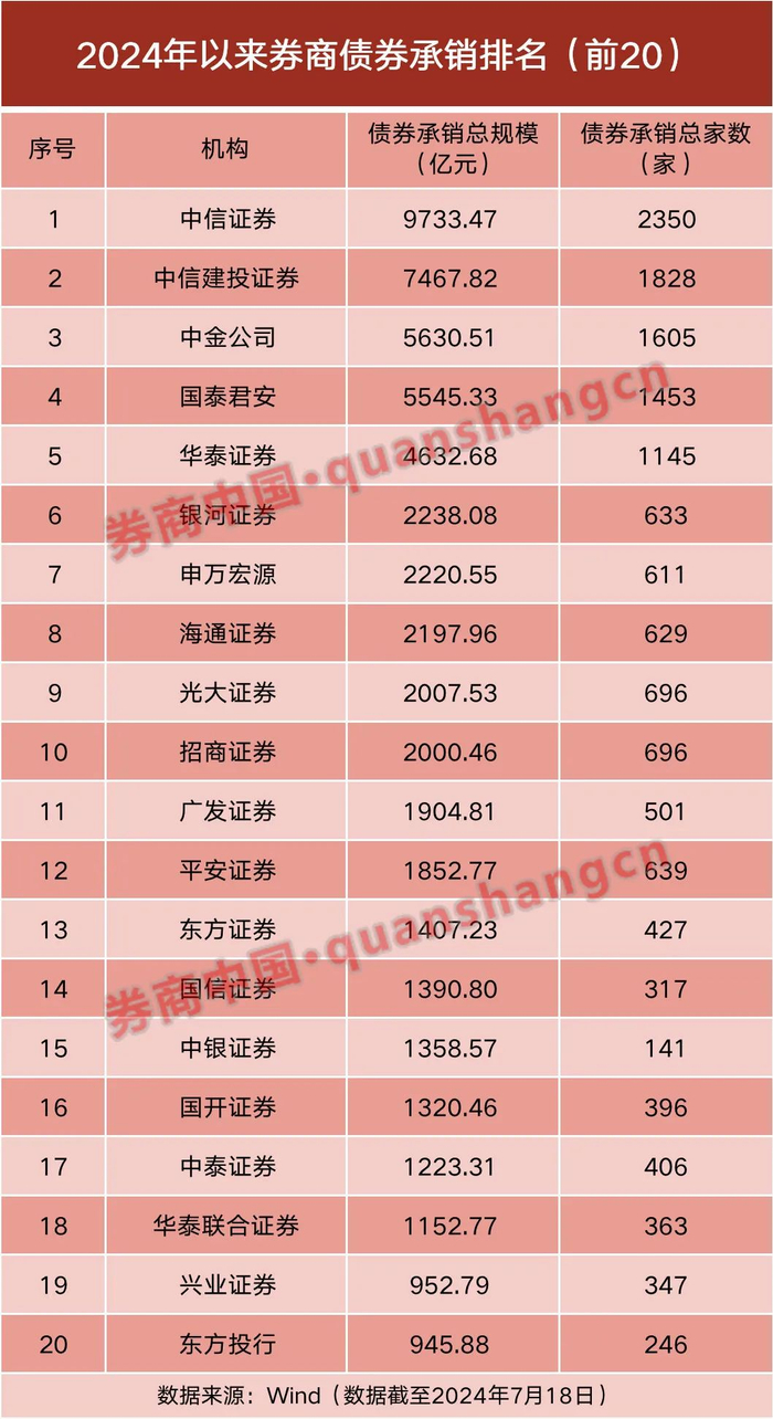 Wind数据显示,按照上市日口径,截至7月18日,今年以来券商合计债券承销规模为67909亿元,同比增长约4.3%;合计承销债券家数19159家,同比增长约9.5%。