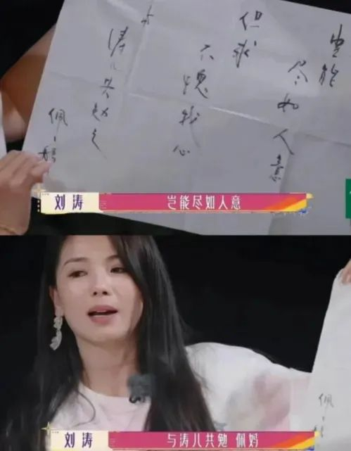 刘涛在节目中表示,郑佩佩对于她来说,是情绪价值也是暖心依靠。据她回忆,在自己压力最大时,郑佩佩曾亲笔写下一副“岂能尽如人意,但求不愧我心”的字帖鼓励她,这副字帖被刘涛珍藏了十年,“当我自我怀疑的时候,有这句话就够了。”