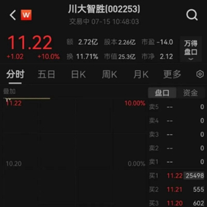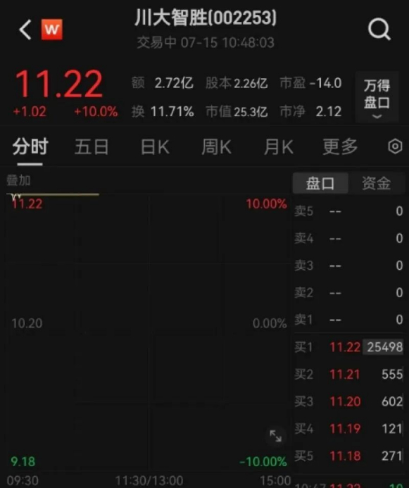 7月15日,A股上市公司川大智胜开盘涨停,并在破板后迅速回封直至收盘。