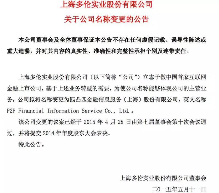 2015年时,随着 互联网 金融的大火,彼时主营 房地产 的多伦股份发布了一则公告,表示自己将更名为P2P的谐音——“匹凸匹”,意在舍弃旧有业务向时下火爆的互联网金融转型。